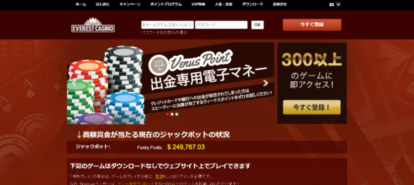 オンラインカジノはおろか、インターネットが誕生して間もない1996年から営業している「EVEREST CASINO(以下エベレストカジノ)」というオンラインカジノサイトがあります。